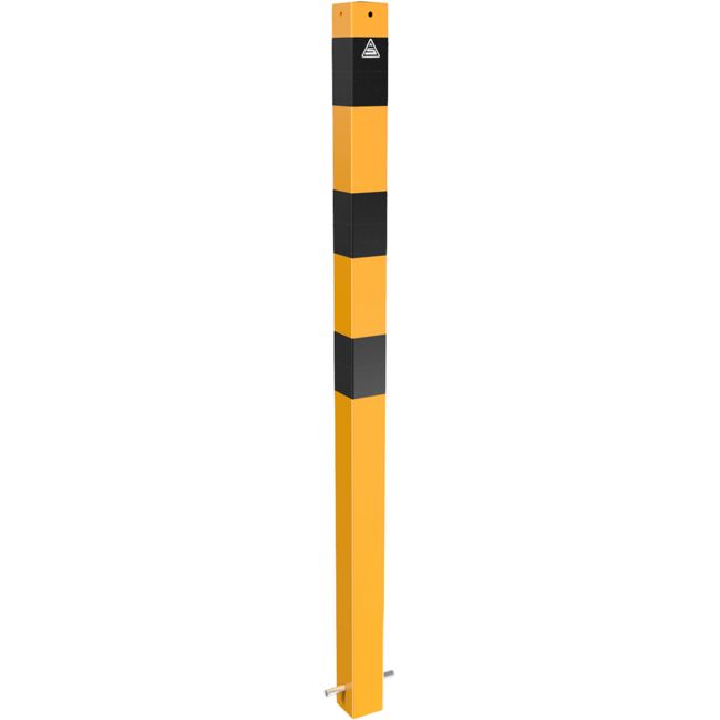 Beschermpaal vierkant 70x70 mm met geel/zwart strepen 90 cm boven de grond. Verschillende montageopties en optie voor kettingogen.