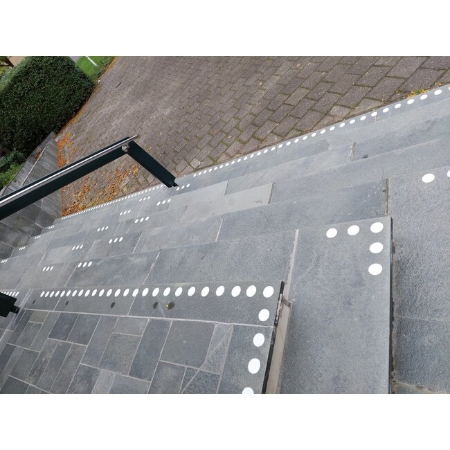 Het niet opmerken van een trap, kan tot vervelende situaties leiden. Helaas valt niet iedere trap even goed op. En dan is zijn er nog mensen met een visuele beperking en daardoor bijv. geen diepte zien. Om ongelukken te voorkomen, maken we je trappen graag goed zichtbaar. We plaatsen graag stippen, volledige strepen of een combinatie hiervan. Zo creëren we diepte, zichtbaarheid en voorkomen we ongelukken.
