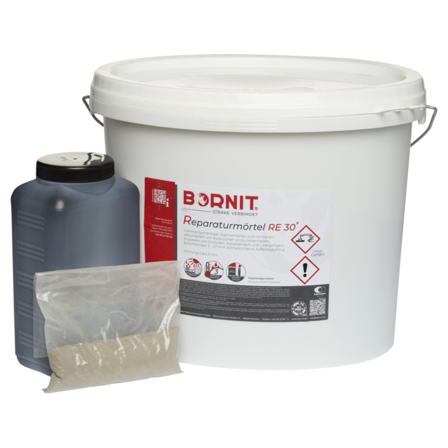 BORNIT- Reparatie Mortel is een meer componenten reparatiemortel voor asfalt- of betonwegen welke bestaat uit een speciale mix van mineralen, een versnellend component en een met polymer gemodificeerde Bitumenemulsie. Door het mixen van alle componenten met elkaar en toevoeging van water wordt een sneldrogend reparatiemateriaal gemaakt waarmee gaten tot 30 mm in één keer gevuld kunnen gaan worden. Diepere oneffenheden kunnen met een tweede maal aanbrengen moeiteloos gelijk gemaakt worden de korrelgrootte is 0-3 mm