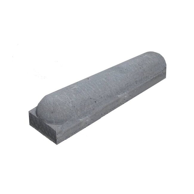 Antraciet betonnen stootband met een ronde en een rechte kant, ideaal voor zichtbare rijbaanafscheiding, parkeerplaatsen en terreinafscheidingen. Duurzaam en onderhoudsarm voor langdurige bescherming van wegen en infrastructuur. Extra zichtbaarheid.