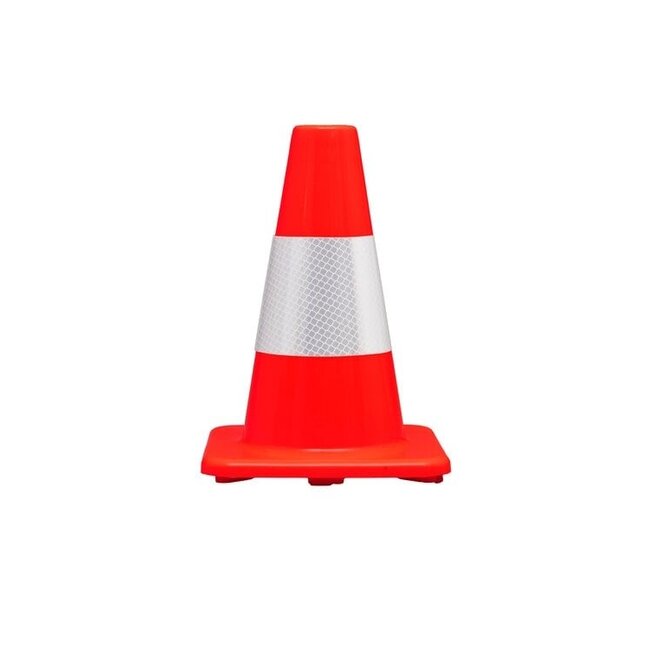 Dankzij de witte reflectieband is de verkeerskegel goed zichtbaar bij daglicht én in omstandigheden met minder licht, zoals schemer of kunstverlichting. De vierkante voet biedt extra stabiliteit op verharde ondergronden, waardoor de pion stevig blijft staan op parkeerplaatsen, werkvloeren en evenemententerreinen.