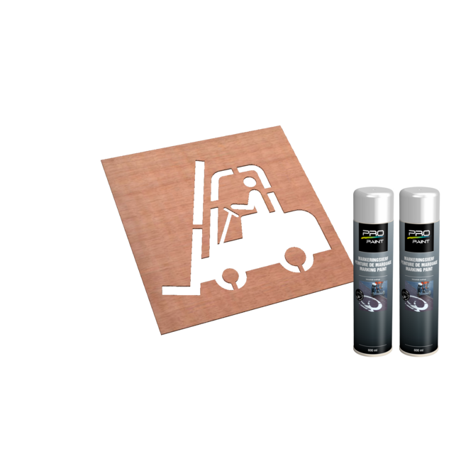 Wilt u duidelijkheid creëren in uw magazijn en aanduiden waar heftrucks mogen rijden maak dan gebruik van onze spuitsjabloon voor heftrucks. De spuitsjabloon wordt geleverd met 2 spuitbussen wegenverf wit. Door uw rijbaan voor heftruck kenbaar te maken in het magazijn vergroot u de veiligheid voor de voetgangers en het overige verkeer.